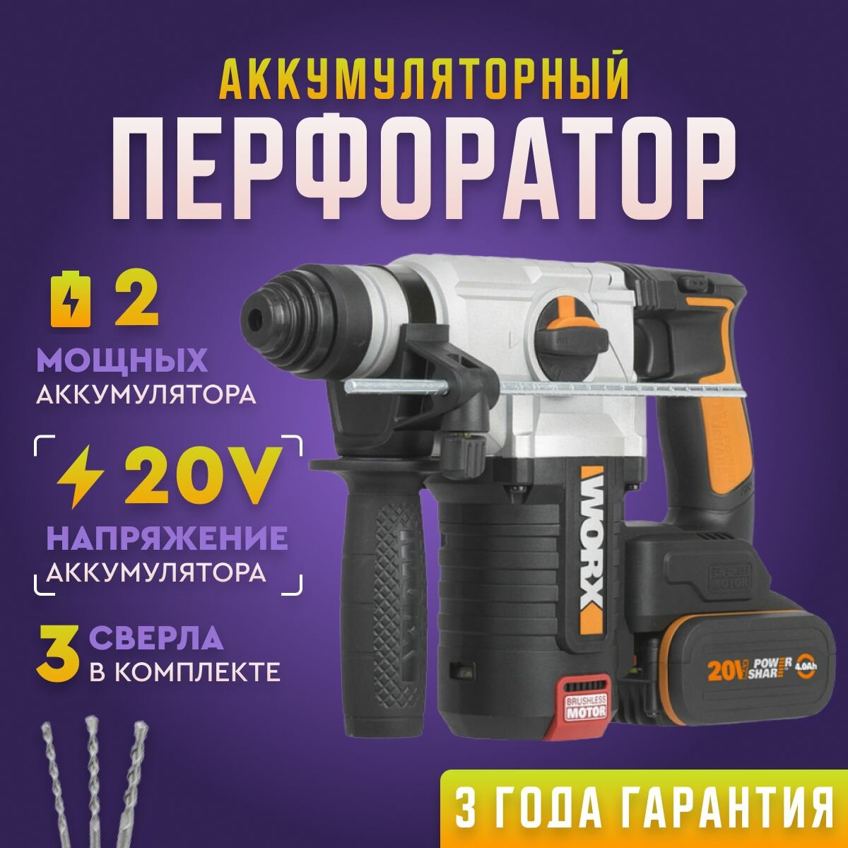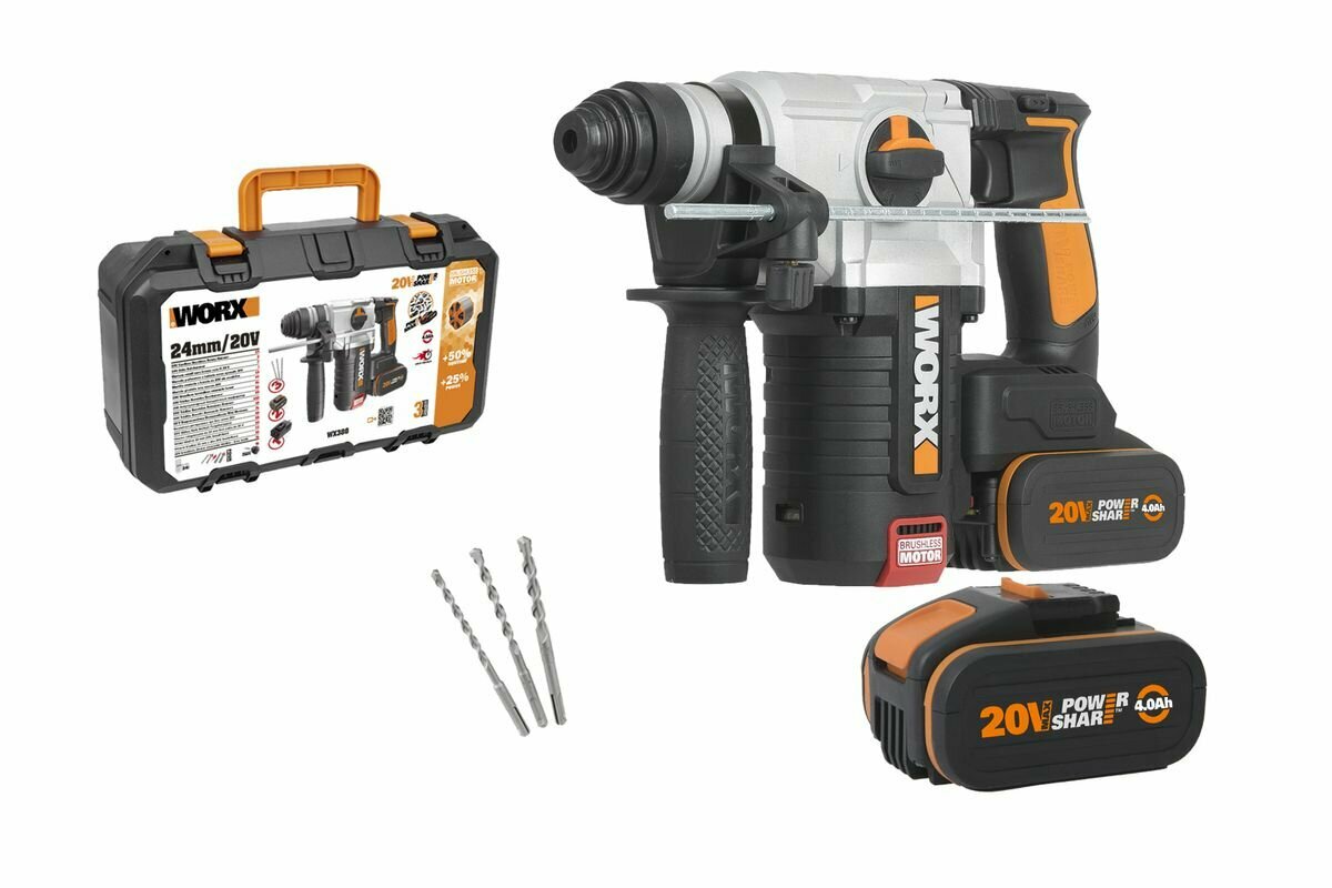 10 цен на Перфоратор аккумуляторный бесщеточный WORX WX380, 20В, 4Ач x2, ЗУ 2А, кейс