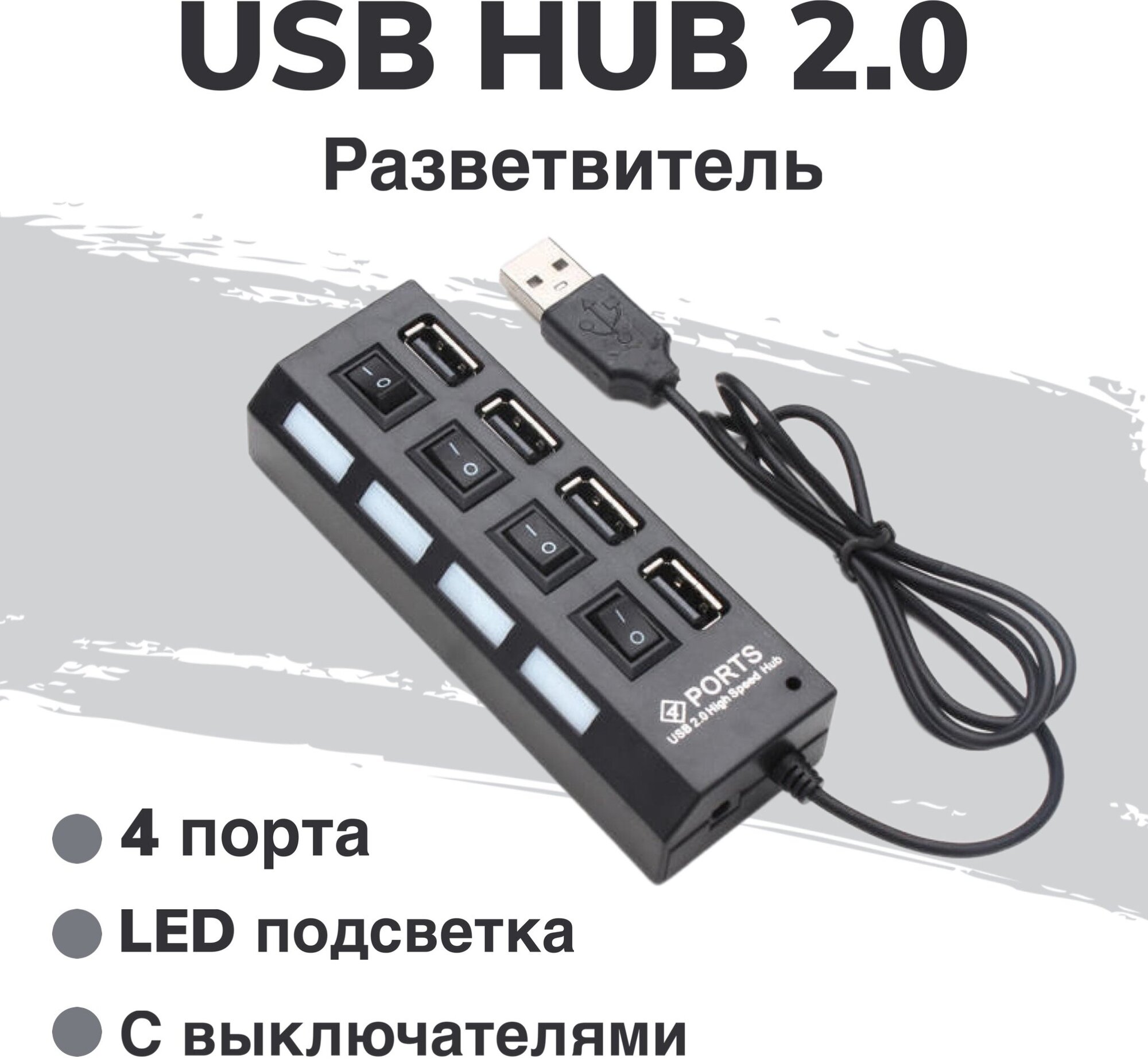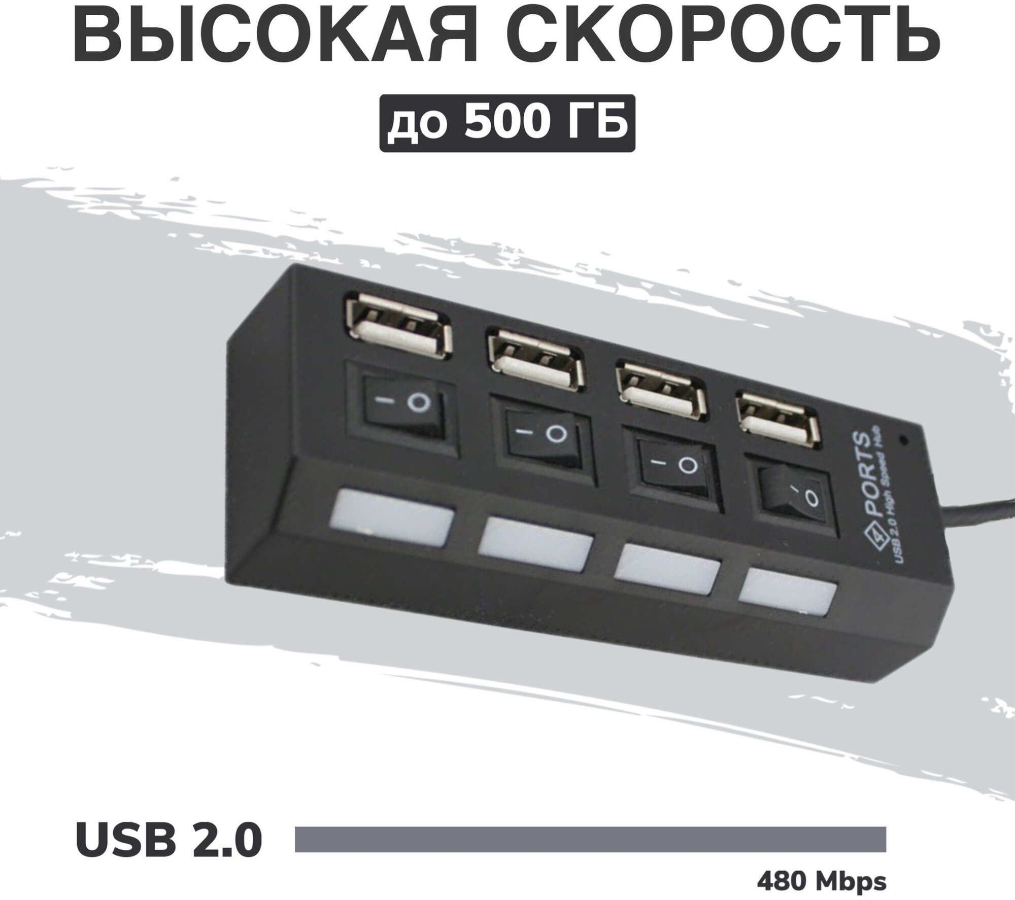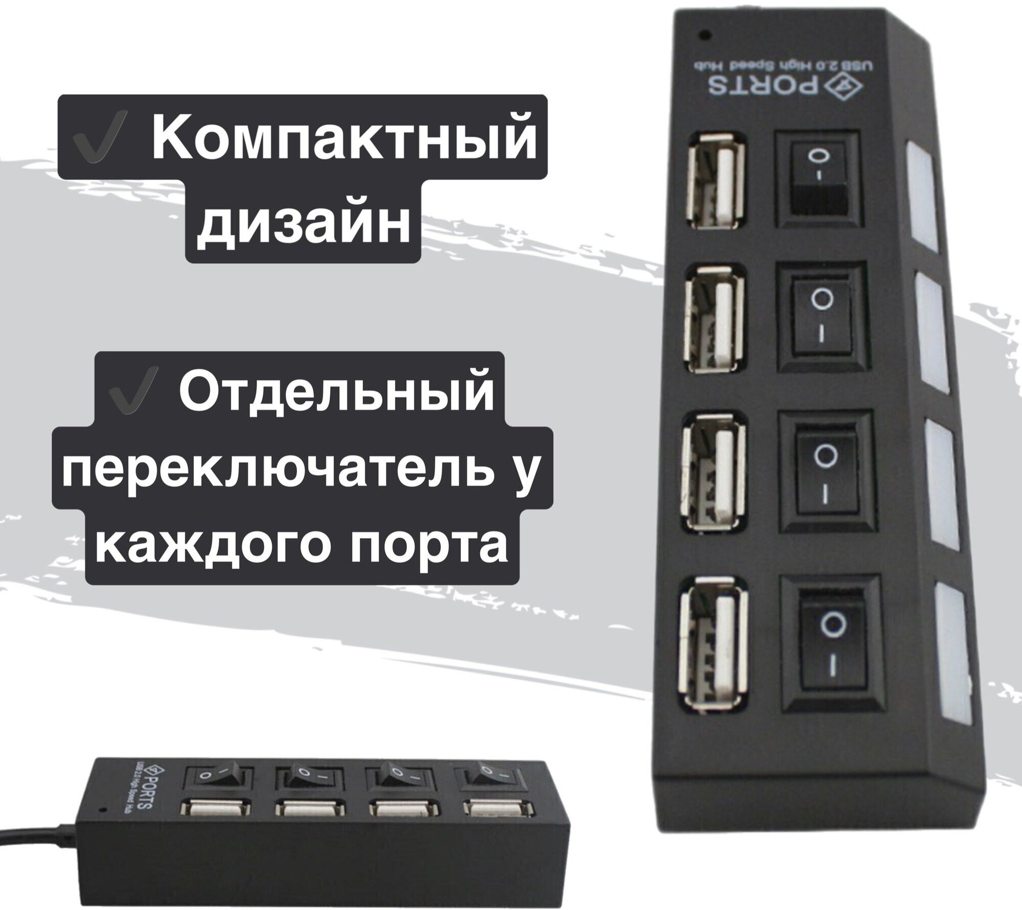 Разветвитель USB Hub на 4 порта с выключателями / USB 2.0 концентратор для переферийных устройств / ХАБ разветвитель - черный информация:
