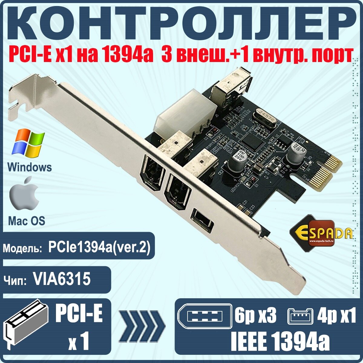 Контроллер PCI-E, 1394a, 3внеш+1внутр порт, модель PCIe1394a(ver.2), Espada информация: