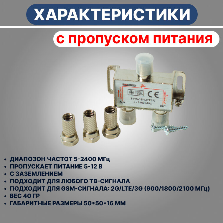 Отзывы на Делитель телевизионного сигнала на 2 выхода с пропуском питания 5-2400МГц (двойник, разветвитель) + 3 F-коннектора