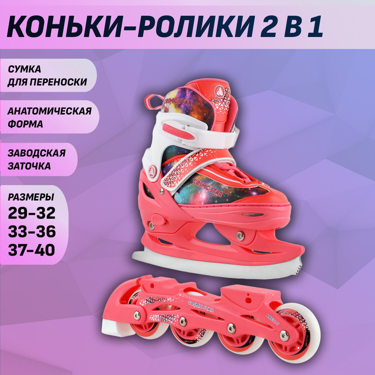Раздвижные роликовые коньки (со сменными лезвиями) Cosmic Star Pink M (33-36) 4 950 ₽