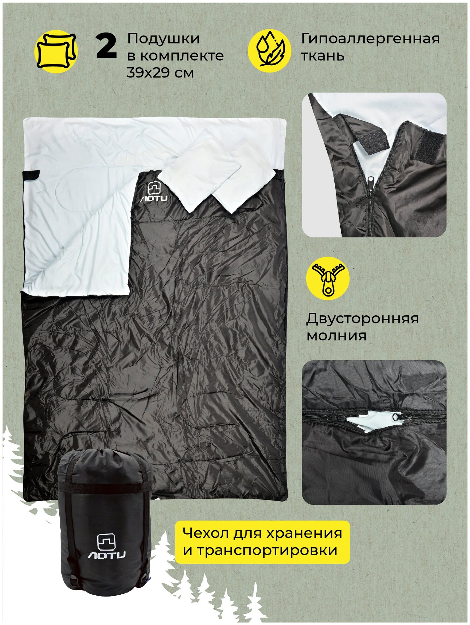 Отзывы на Водонепроницаемый спальный мешок двойной AT6119 с подушками (190+30)х152см черный / Двухместный спальник с подголовником