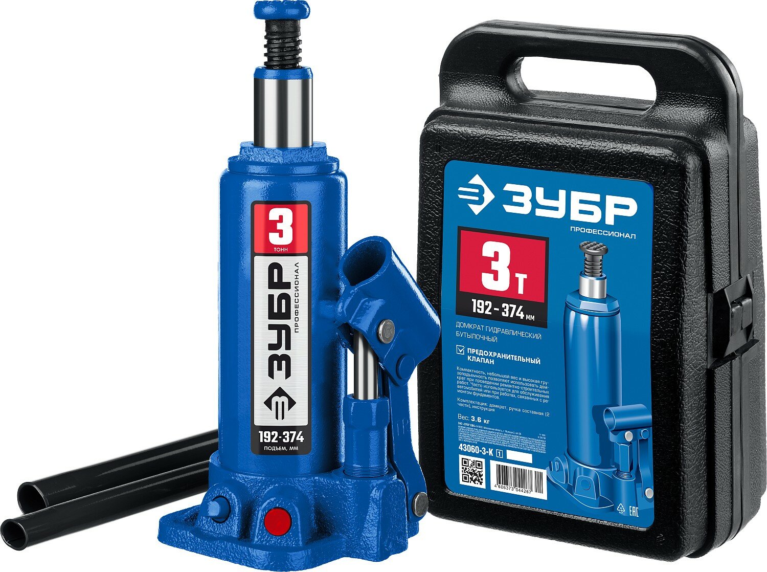 10 цен на ЗУБР 3 т, 192-374 мм, домкрат бутылочный гидравлический в кейсе 43060-3-K_z01 Профессионал
