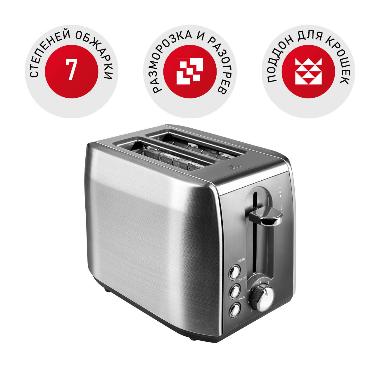 центрирование тостов, 7 степеней прожарки, поддон для крошек, 2 слота