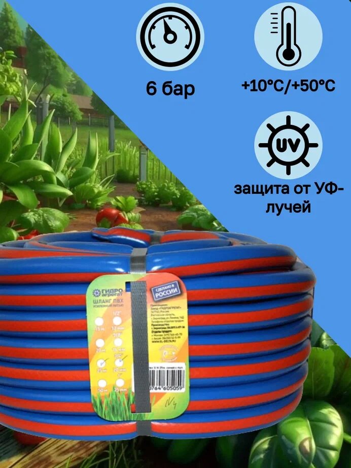 Шланг поливочный Д=1/2" (25м) арм., 3-х слойный Гидроагрегат синий с оранжевой полосой информация: