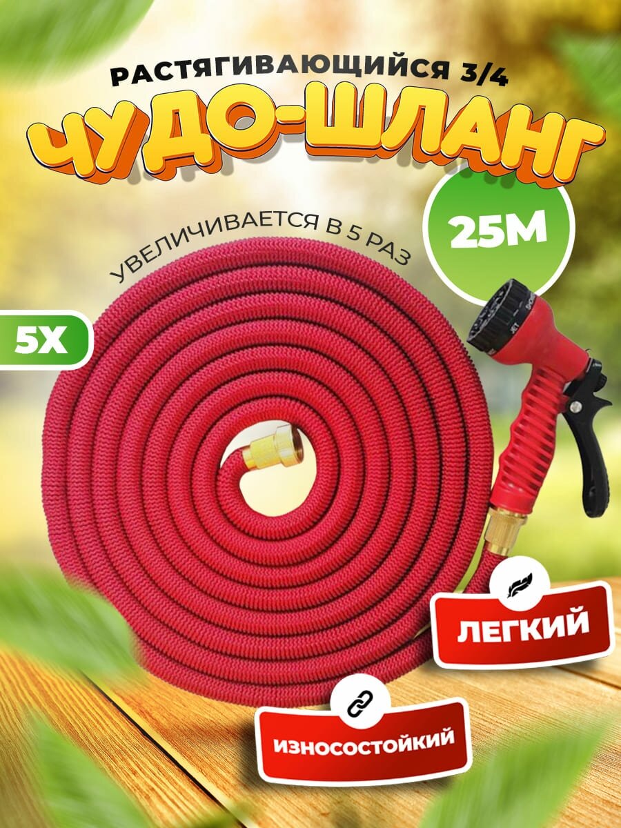 Поливочный шланг 25 м, латунь / Чудо шланг садовый / Растягивающийся шланг для полива / Стрейч шланг саморастягивающийся информация: