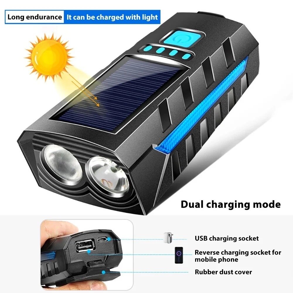 Фонарь передний сверхъяркий велосипедный Linnhill 1000 Lm /велофонарь на солнечной батареи с сигналом и зарядкой, фонарь на самокат