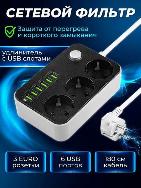Сетевой фильтр, удлинитель, сетевой удлинитель с 3 розетками, 6 usb входов, выключатель на корпусе