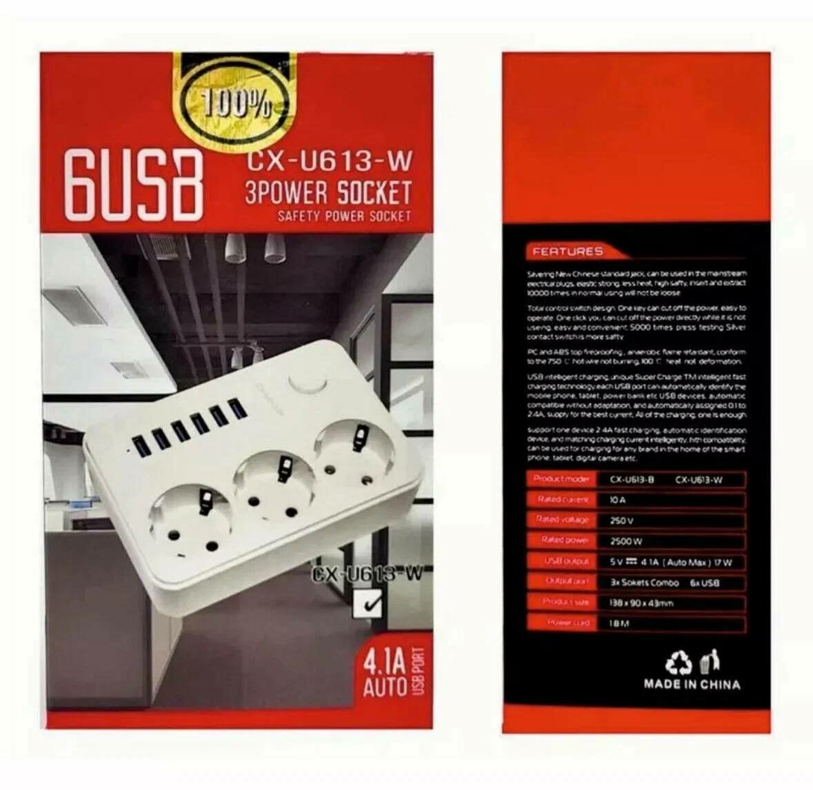 Сетевой фильтр(удлинитель)/Сетевой тройник с переключателем на 4 розетки и 3 входа для USB/тройник/удлинитель CX-E103