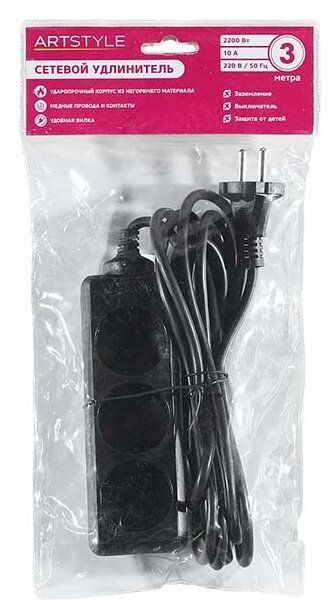 Отзывы на Сетевой удлинитель ARTSTYLE CL-C33B черный, 3 гнезда, 3 метра, 2200Вт, без заземления
