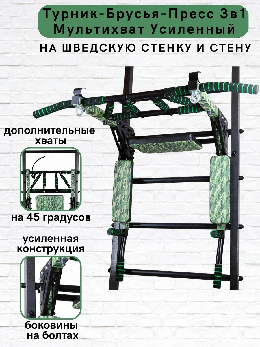 Отзывы на Турник-Брусья-Пресс 3в1 Мультихват Усиленный на Шведскую стенку Камуфляж