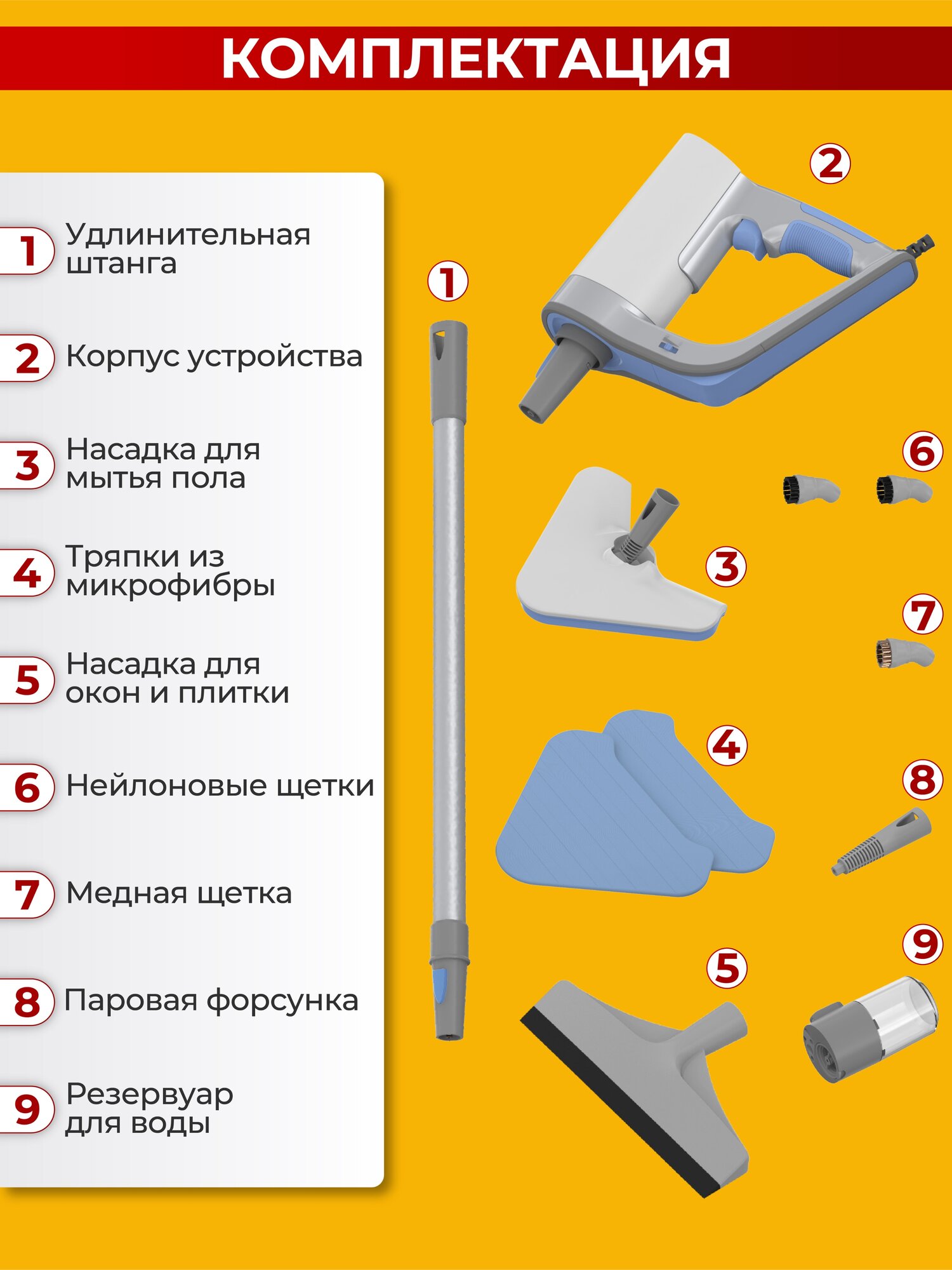 | В комплекте | Доп насадки 5 шт; форсунка, Удлинительная трубка, инструкция, мерный стаканчик, швабра |