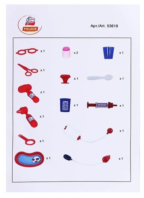 | Комплектация | Ножницы, очки, лупа, шприц, лоток для инструментов, ложечка, стетоскоп, тонометр, отоскоп, молоточек, мерный стаканчик с крышкой, стаканчик, баночки |