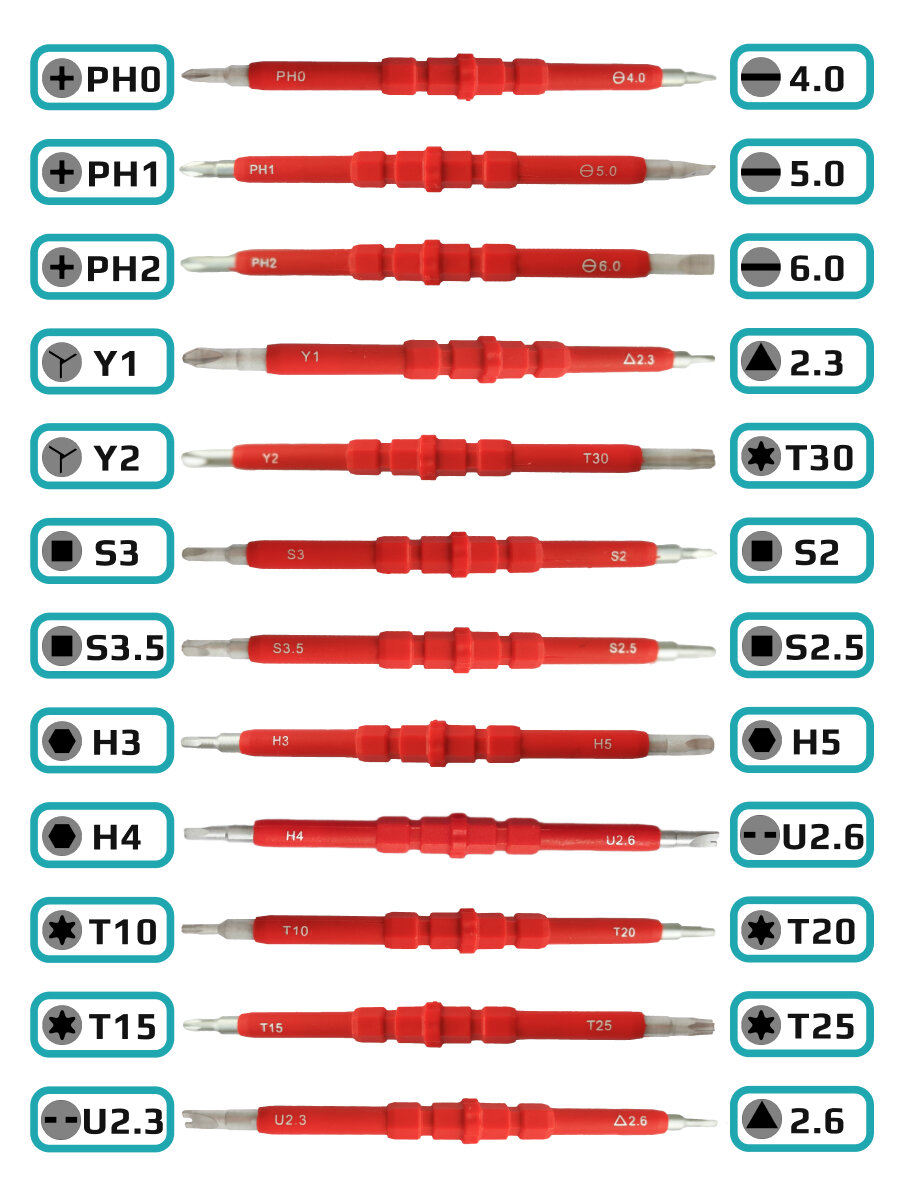 | Отвертки подробно | PH0, PH1, PH2, Y1, Y2, S3, S3.5, H3, S2, S2.5, H5, H4, U2.6, T10, T20, T15, T25, U2.3, |