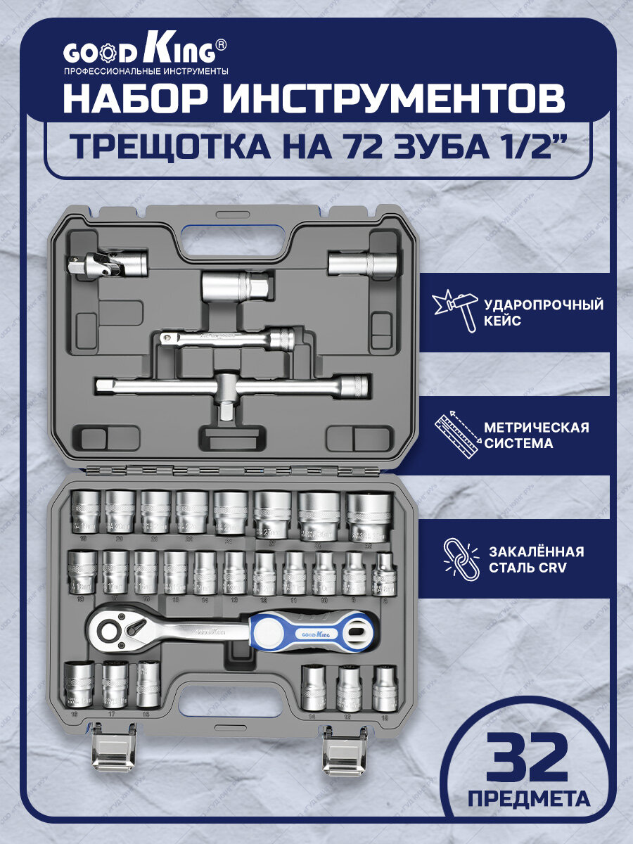 Набор инструментов 32 предмета 1/2" трещотка 72 зуба GOODKING 10032-B для автомобиля для дома информация: