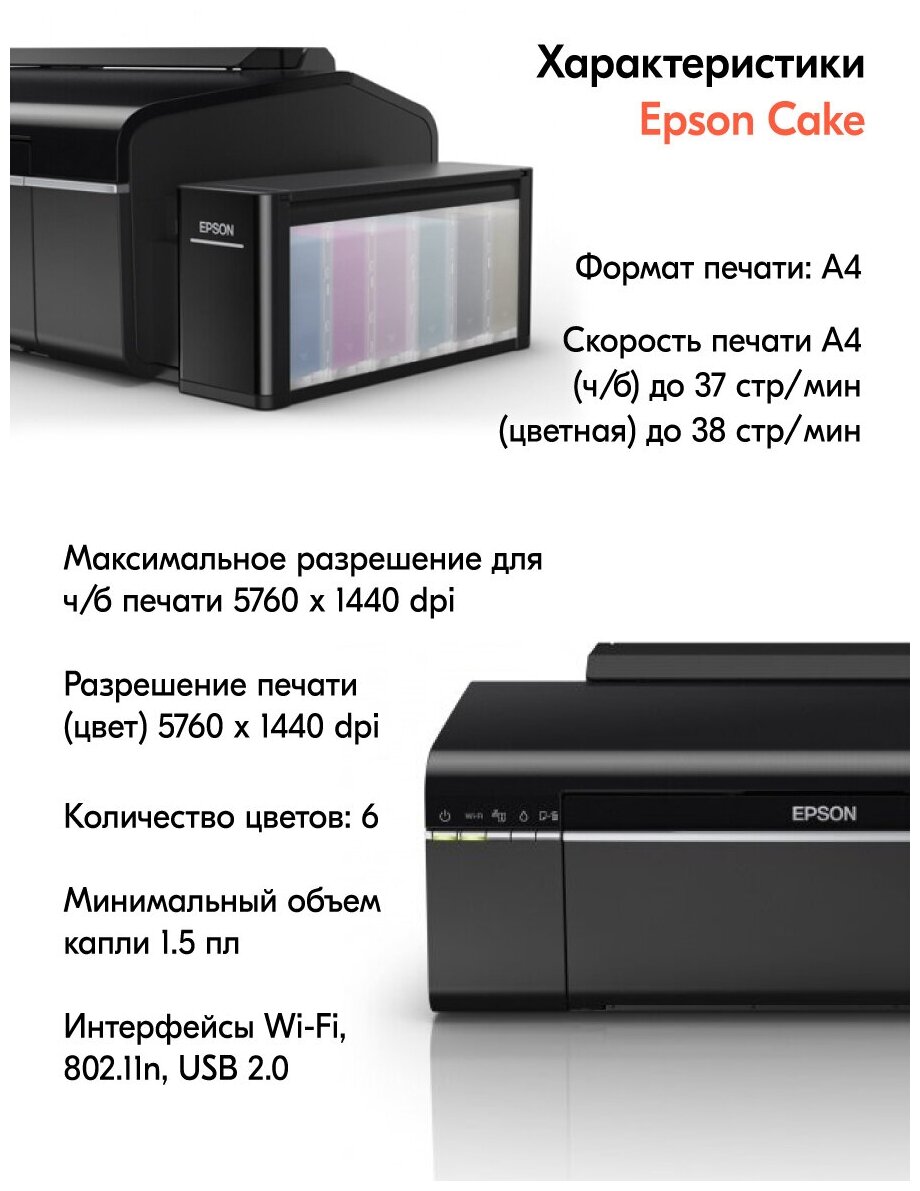 Пищевой принтер Epson 805 Cake WI-FI с СНПЧ, стартовый набор №1(пищевые чернила, промывочная жидкость, сахарная бумага), съедобная печать для тортов информация: