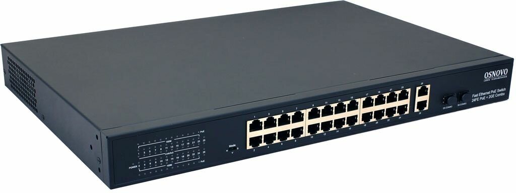 Коммутатор/ OSNOVO PoE коммутатор 24 x 10/100 Base-T PoE, 2 x GE Combo Uplink (RJ45 + SFP), PoE на порт - до 30W, суммарно PoE до 385W информация: