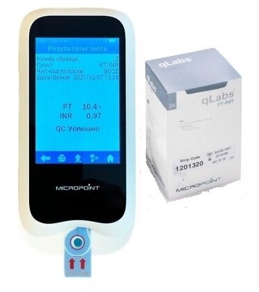| Комплектация | экспресс-коагулометр для оценки показателей Протромбинового Времени (PT) и МНО (INR), Micropoint Bioscience Inc. (Китай) – 1 шт. Блок питания – 1 шт. Чехол для ношения коагулометра – 1 шт. Ланцеты – 12 шт. Инструкция по эксплуатации на русском языке – 1 шт. USB-накопитель. Гарантийный талон (сертификат) - 1 шт. Тест-полоски qLabs |