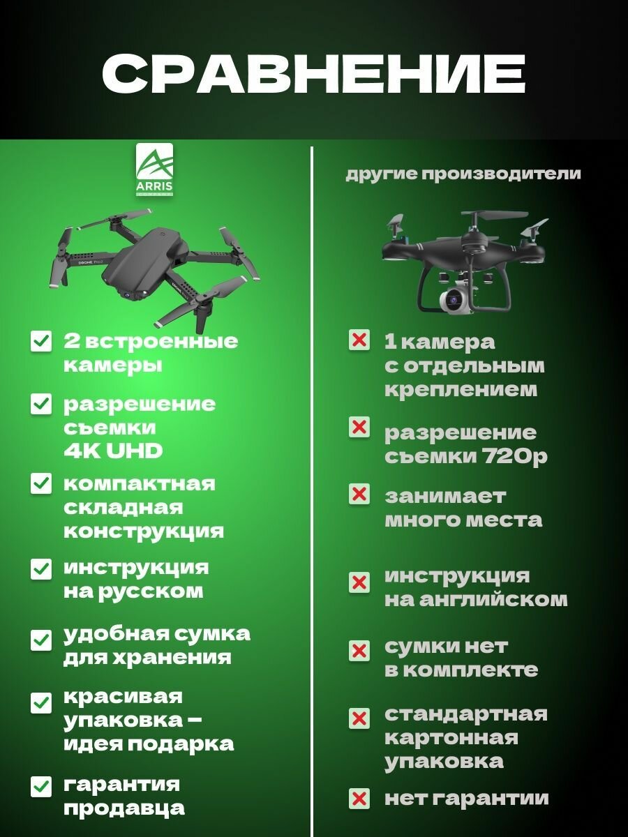 | Комплектация | Складной квадрокоптер, пульт управления, 3 аккумулятора, защита лопастей, основные лопасти 4+8, USB-зарядка, отвертка, сумка, инструкция |