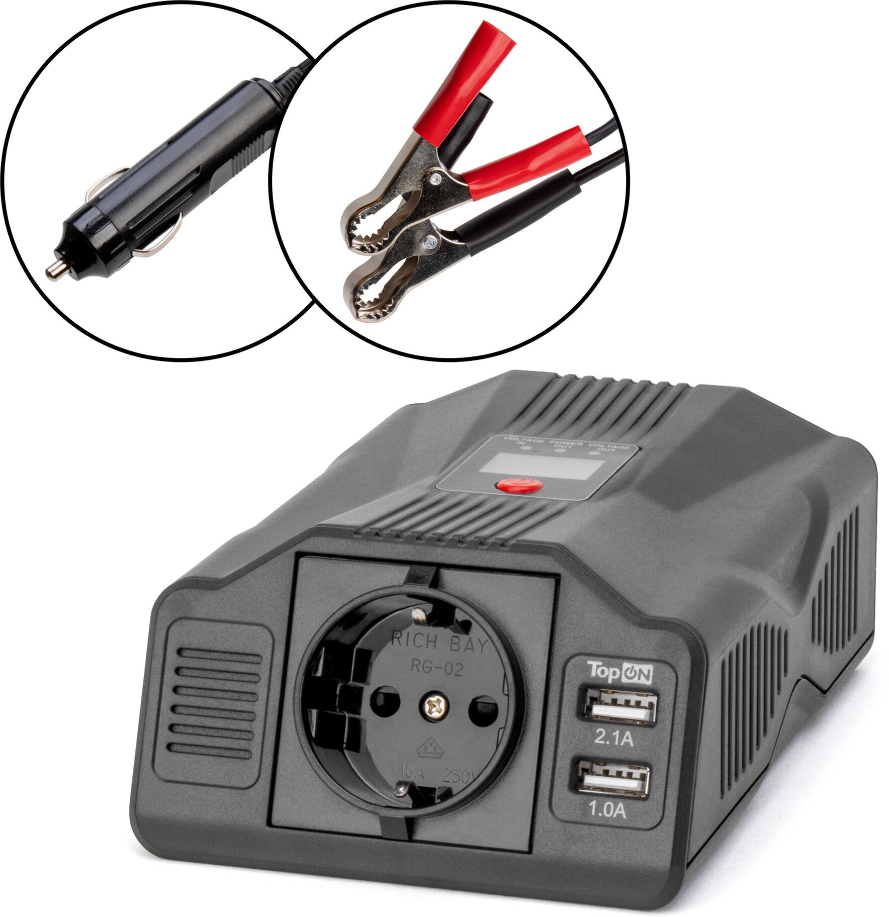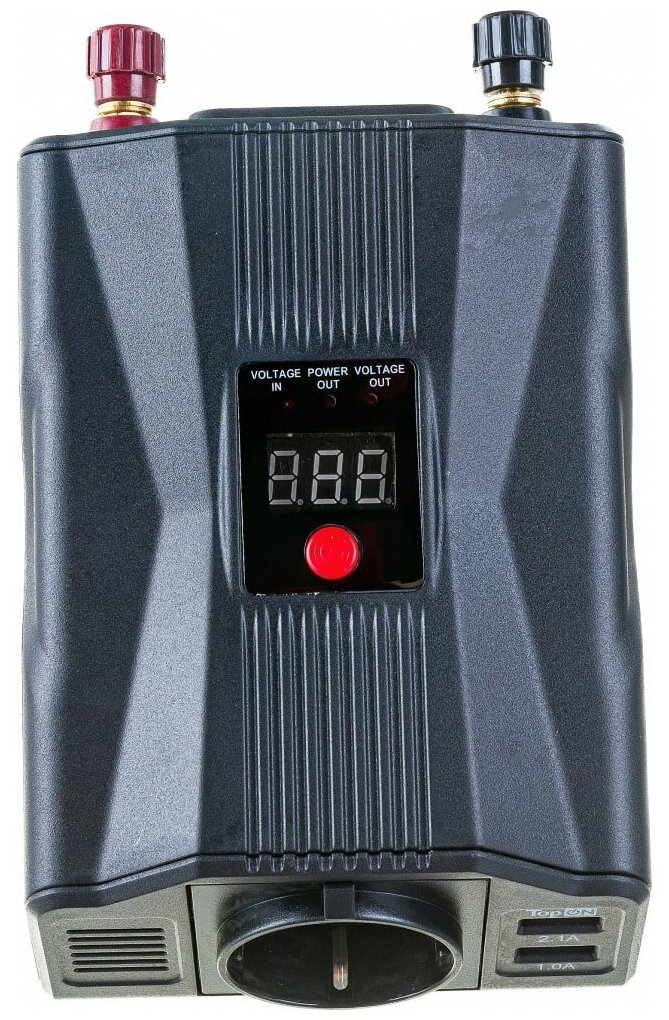 10 цен на Автомобильный инвертор TopOn 200 Вт, 1 розетка, 2 USB, LCD экран, пиковая мощность 400 Вт, черный TOP-PI201