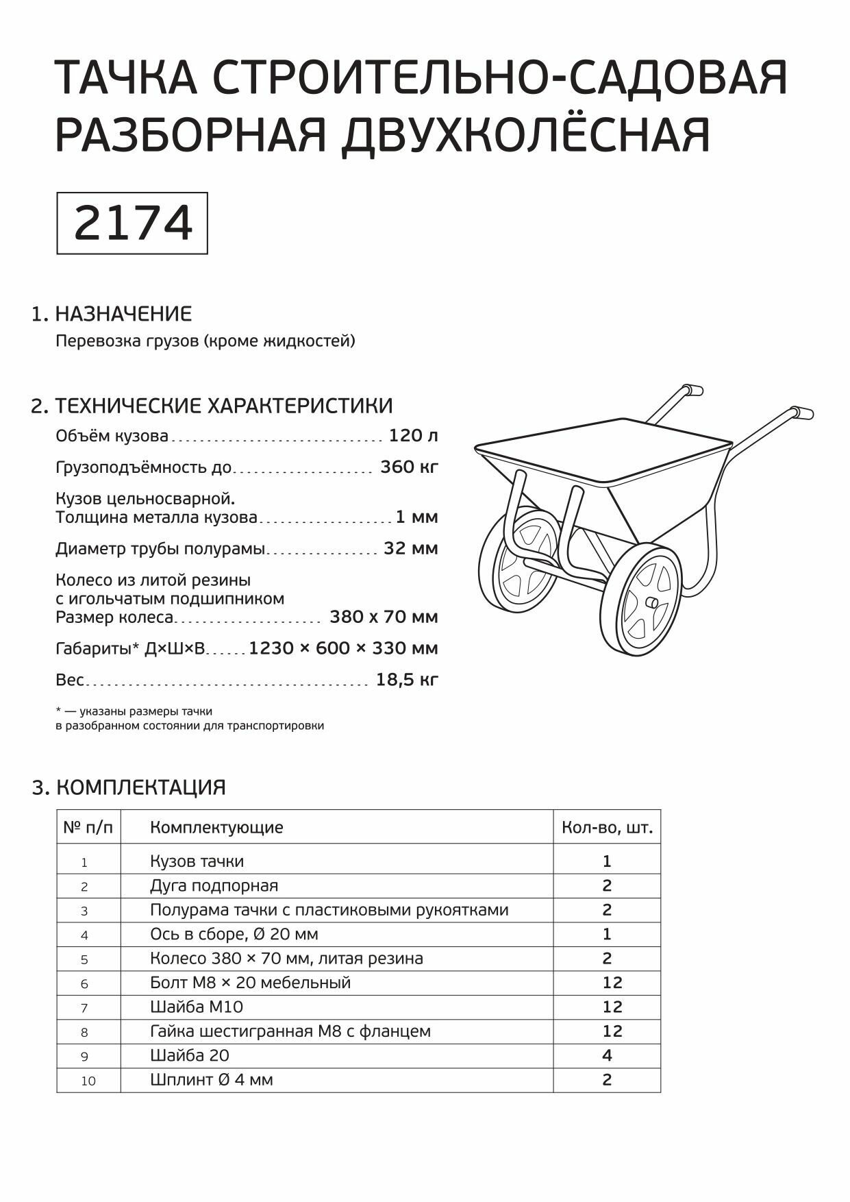 Тачка строительно-садовая 2174 Кузбасс двухколесная 120л информация: