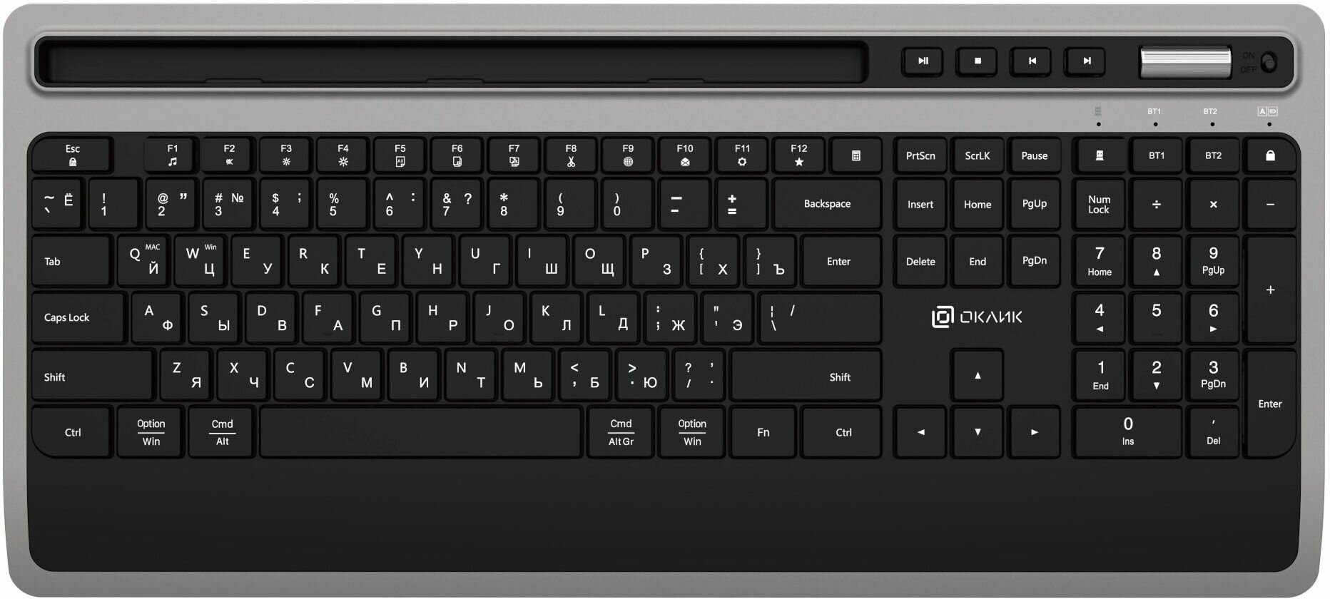 10 цен на Клавиатура Оклик 860S серый/черный USB беспроводная BT/Radio slim Multimedia (подставка для запястий) (1809323)