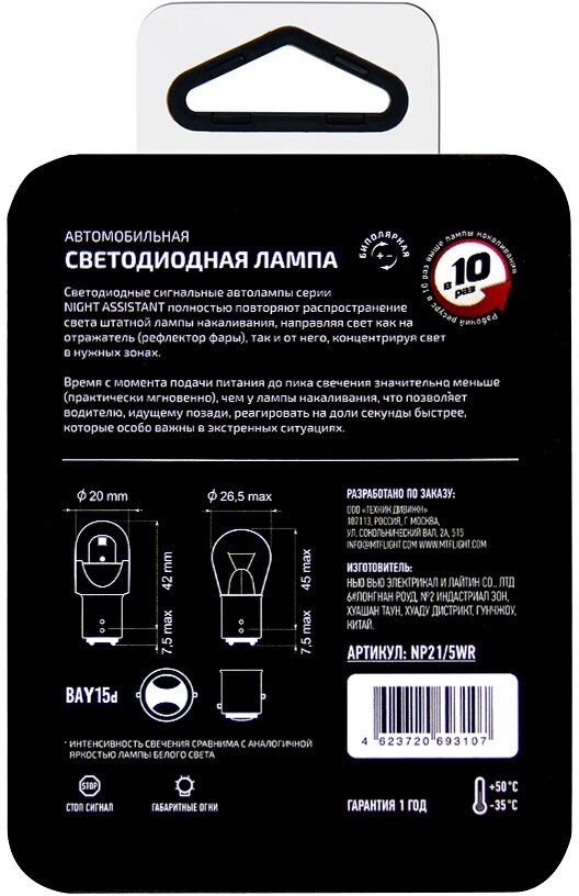 Светодиодная автолампа MTF Light серия Night Assistant 12В, 2.5Вт, P21/5W, красный, блистер, шт. информация: