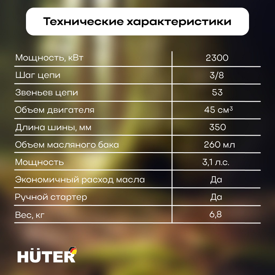 | Особенности | Легкий и надежный инструмент для дачи и небольшого загородного строительства Рукоятка Huter BS-4514 70/6/21 имеет удобную для захвата форму Расширенная нижняя часть рукоятки - для защиты руки при разрыве цепи Антивибрационная система Тормоз цепи - для безопасности оператора Автоматическая смазка цепи Ширина паза, мм 1.3 Количество звеньев 53 |