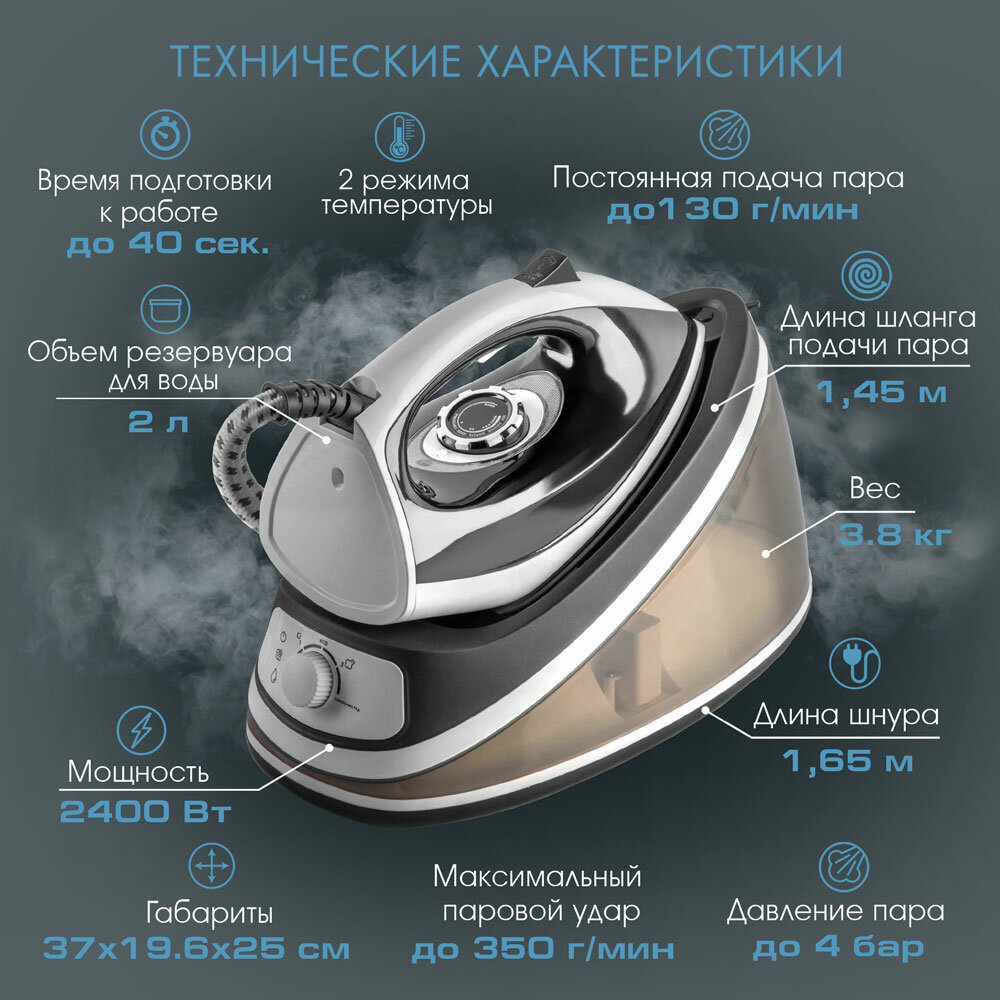 Утюг с парогенератором для одежды VLK Vesuvio-5400 / паровой удар до 350 г/мин / вертикальное отпаривание информация:
