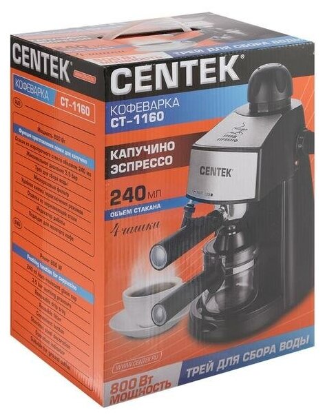 Кофеварка CENTEK CT-1160/ черный/сталь/ эспрессо/ капучинатор/ 800 Вт/ 240 мл/ 3.5 Бар 4 200 ₽