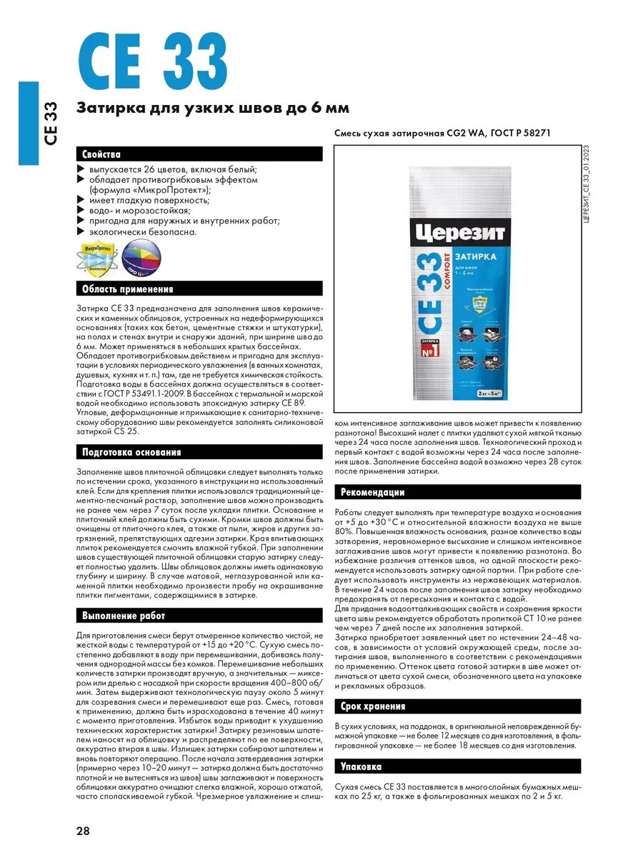 Затирка для Узких Швов 25кг до 6 мм Ceresit CE 33 Comfort Белый 01 / Церезит СЕ 33 Комфорт.