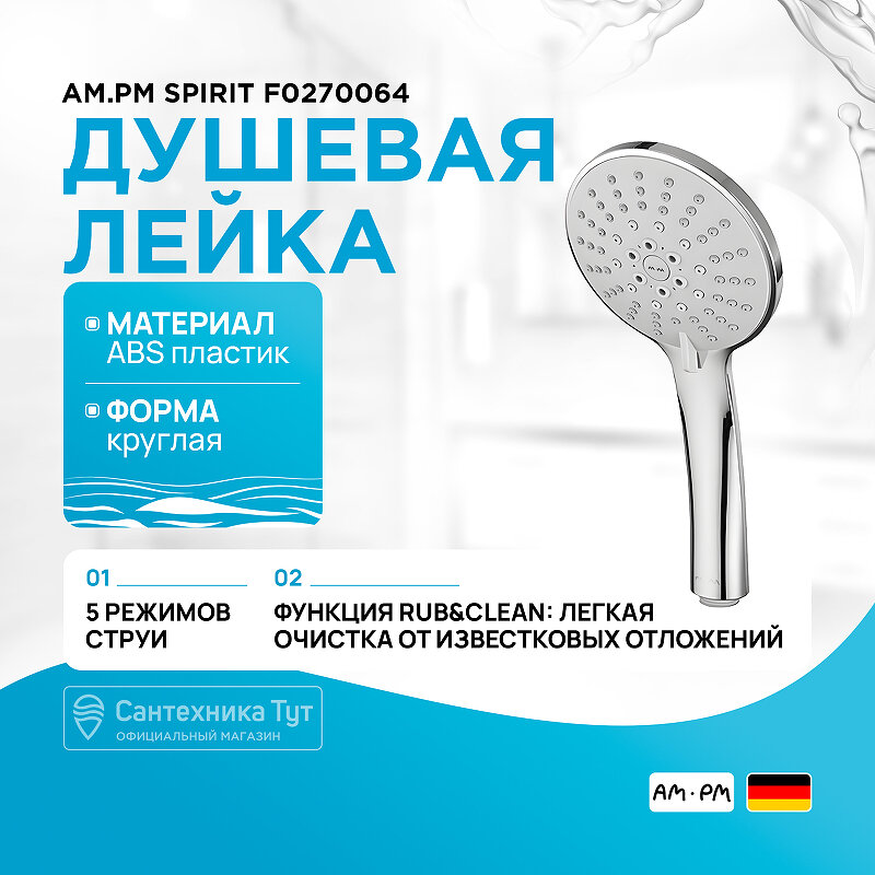 Ручной душ для ванной комнаты AM.PM Spirit F0270064 5 функций, d 115 мм, хром