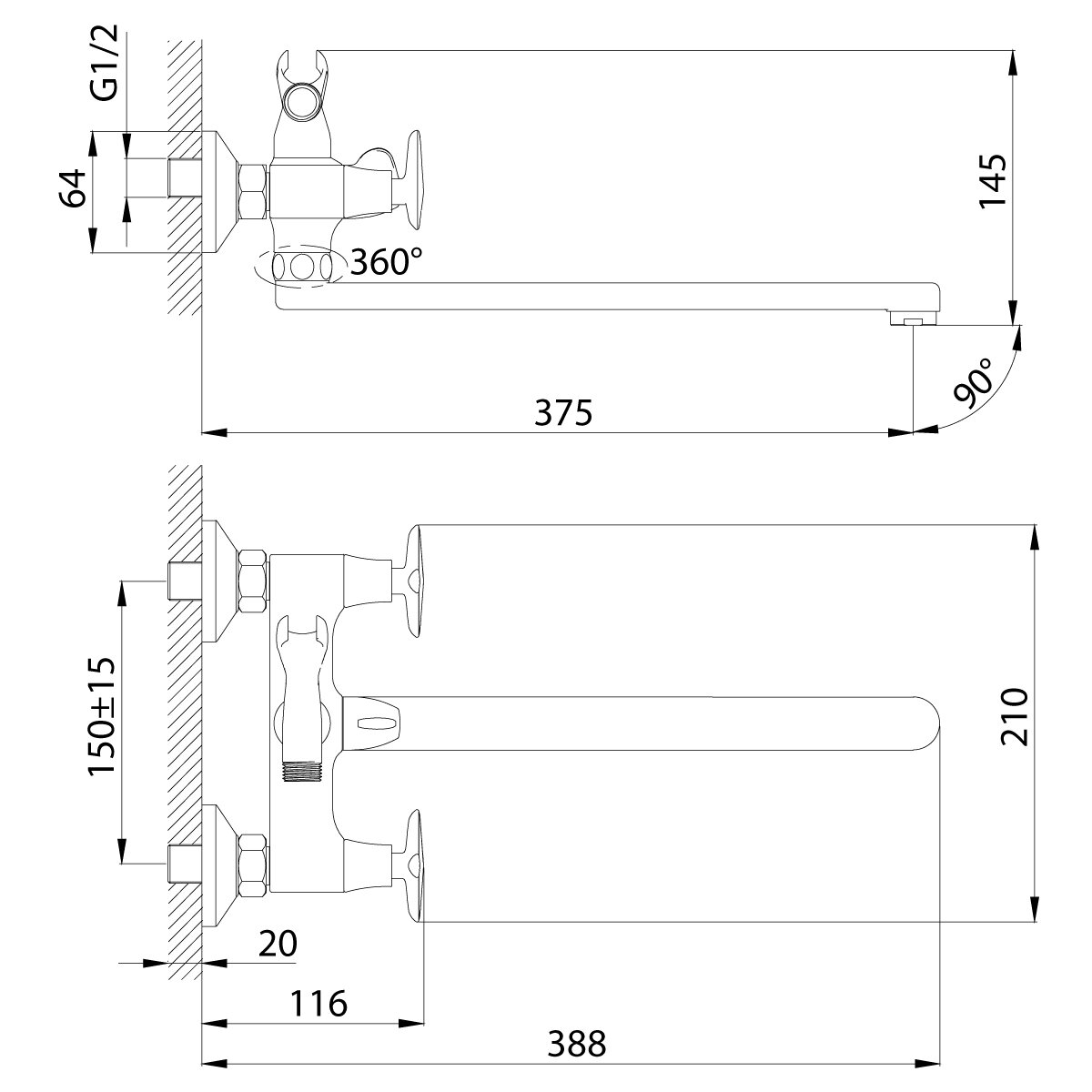 Смеситель на раковину настенный Эверест B46-350 с круглым поворотным изливом, кран-буксы 1/2", хром