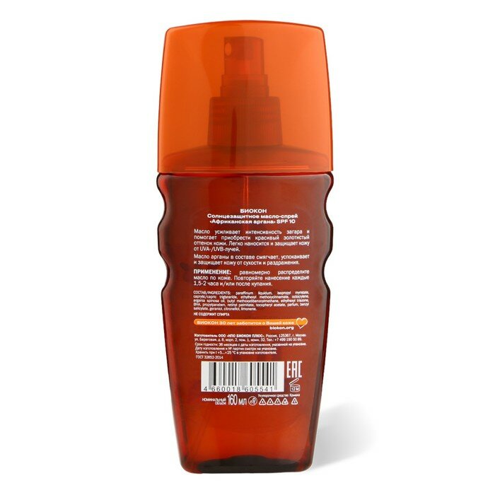 Масло-спрей активатор загара Биокон SPF-10 с аргановым маслом 99%, 160 мл 2380228 информация: