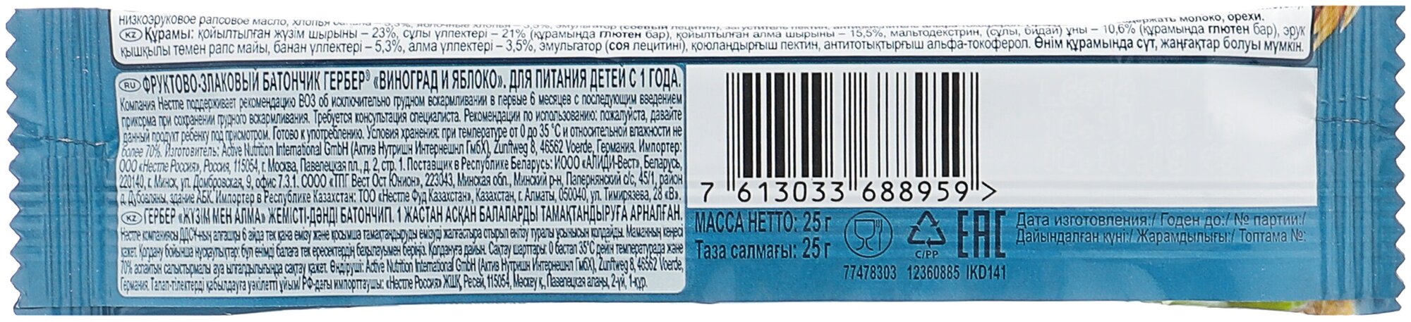 Злаковый батончик с яблоком и виноградом, GERBER, с 12 мес, 25г информация: