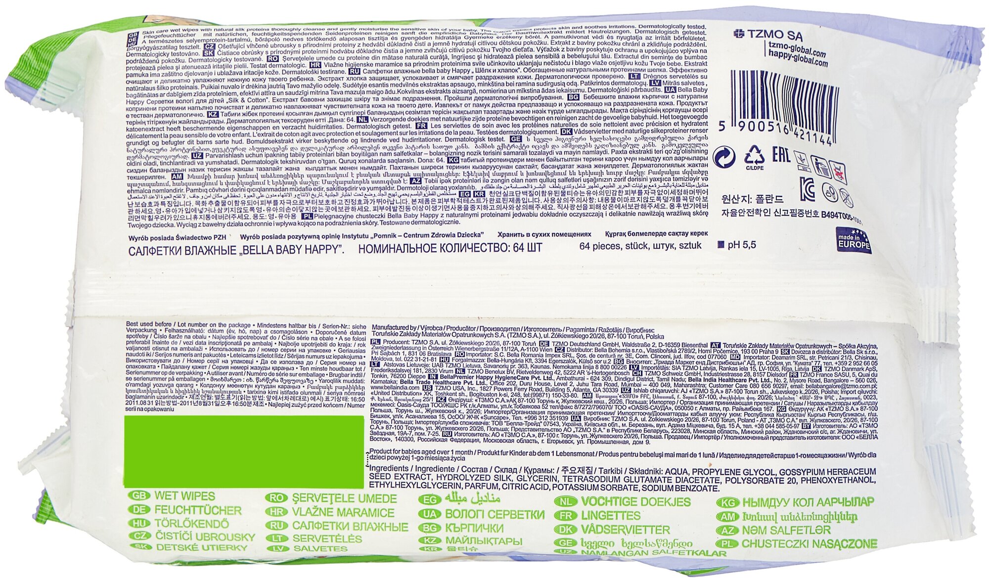 bella baby Happy Влажные детские салфетки "bella baby Happy" "шёлк и хлопок" (Silk & Cotton), 64 шт./уп. информация: