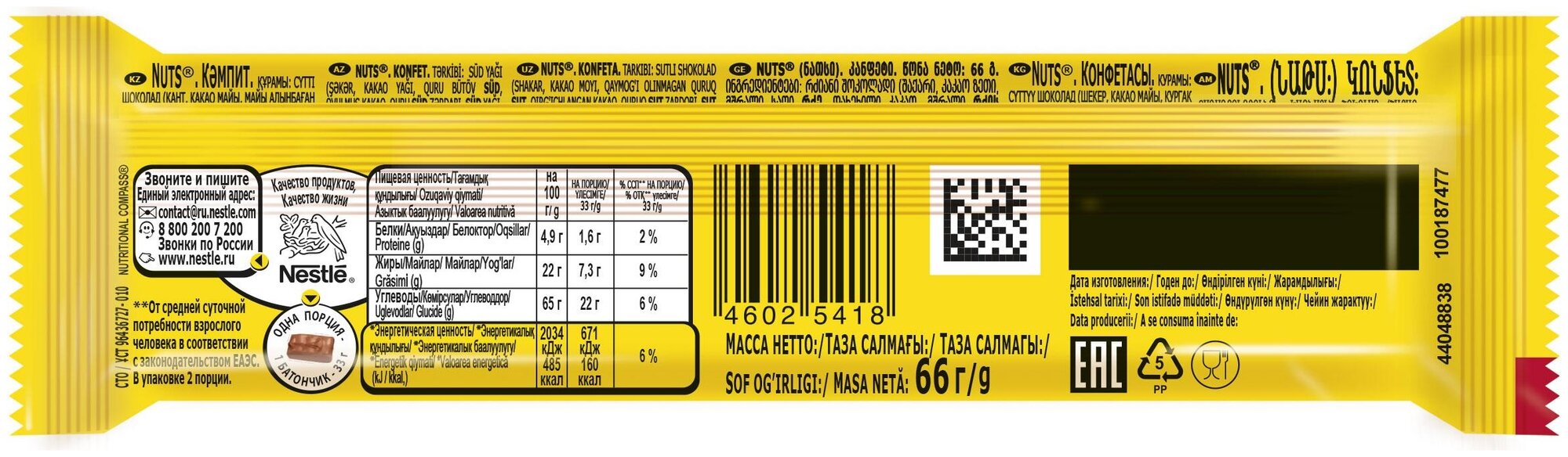 Шоколадный батончик Nuts, 24 шт по 66 г