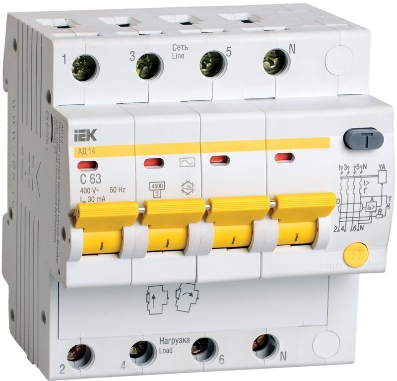 Отзывы на Дифференциальный автомат IEK АД14 4П 30 мА C 4.5 кА AC электронный 63 А