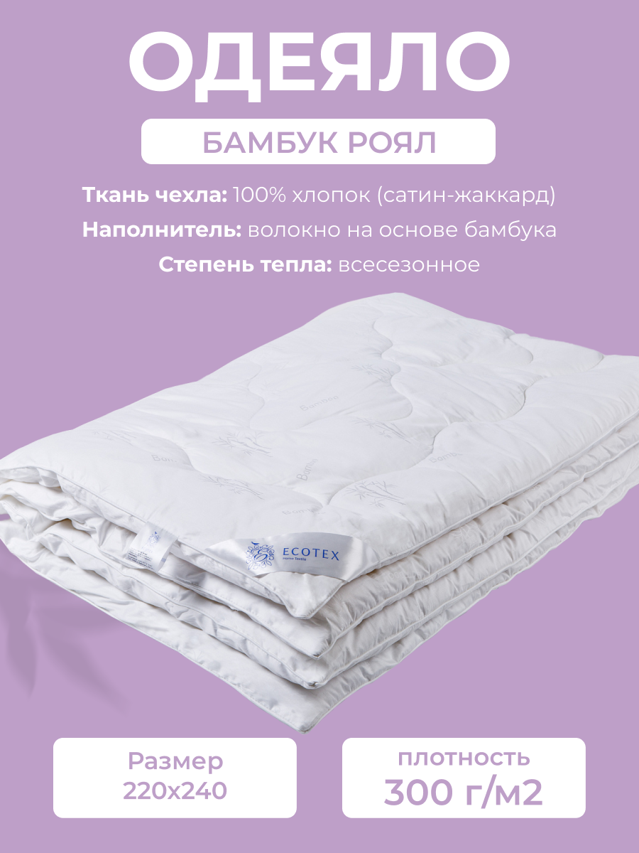Одеяло бамбук семейное (220x240 см) "Бамбук Роял", чехол - сатин-жаккард (100% хлопок), Ecotex информация: