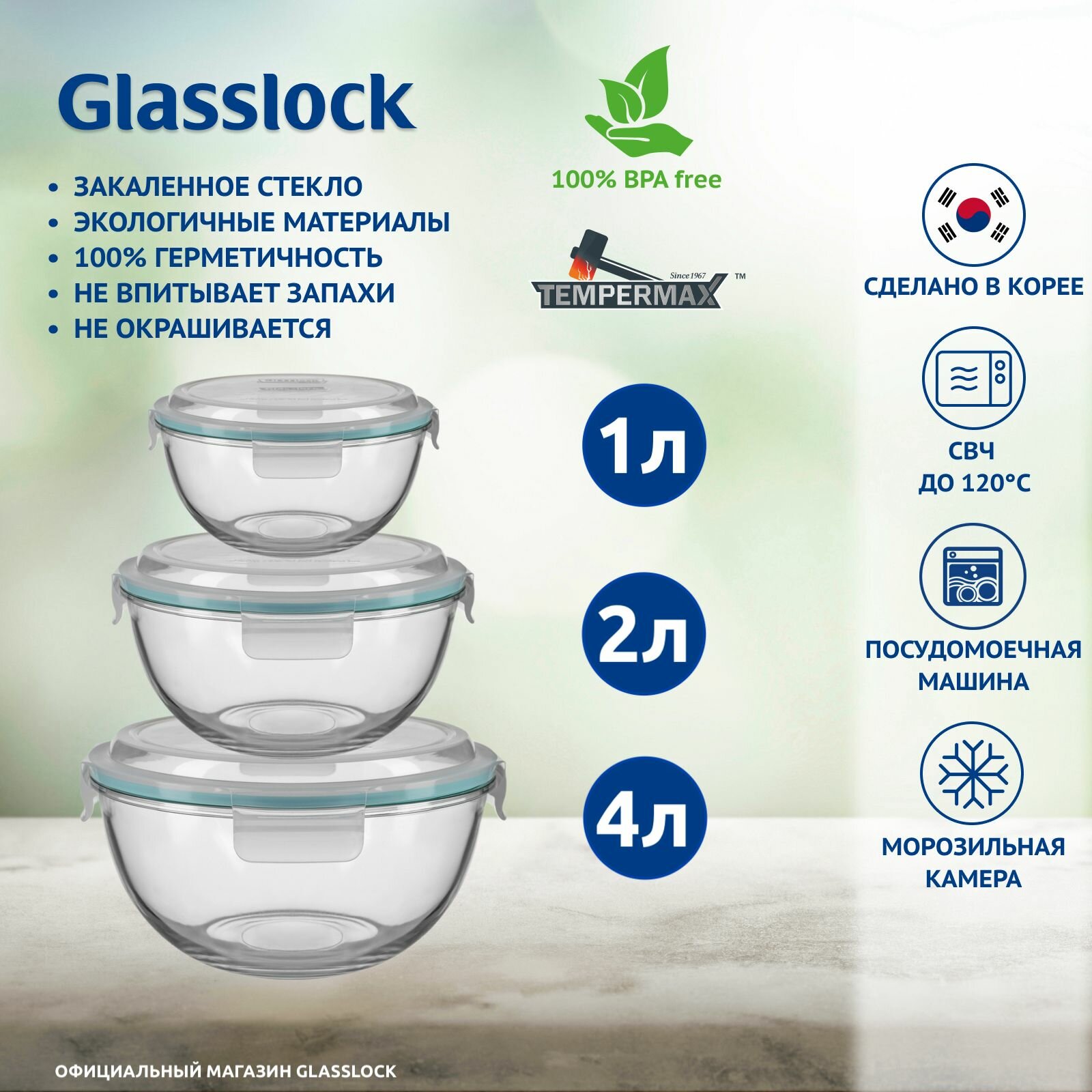 Набор контейнеров Glasslock GL-532 Aqua blue (4000ml, 2000ml, 1000ml; круглые) информация: