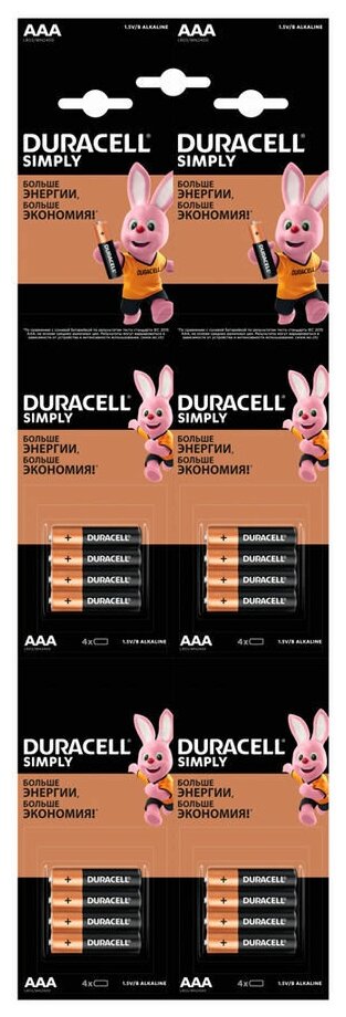 Батарейки комплект 4 шт. (отрывной блок), DURACELL Simply оригинал, AAA (LR03,24А), алкалиновые, мизинчиковые, Б0046869