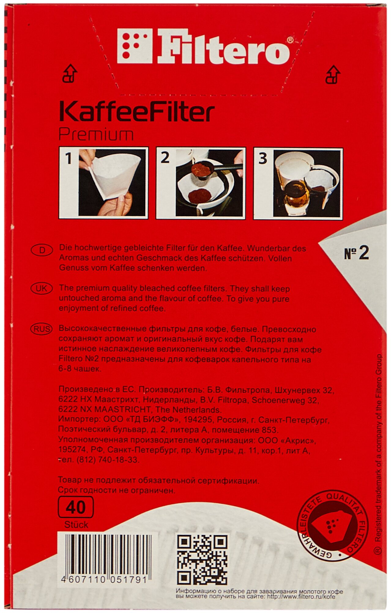 Фильтр для кофеварок FILTERO Премиум №2, бумажный, отбеленный, 40 шт (№2/40)