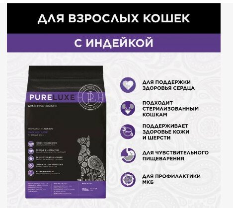 Сухой корм PureLuxe для взрослых котов кошек всех пород, со вкусом индейки, 5кг