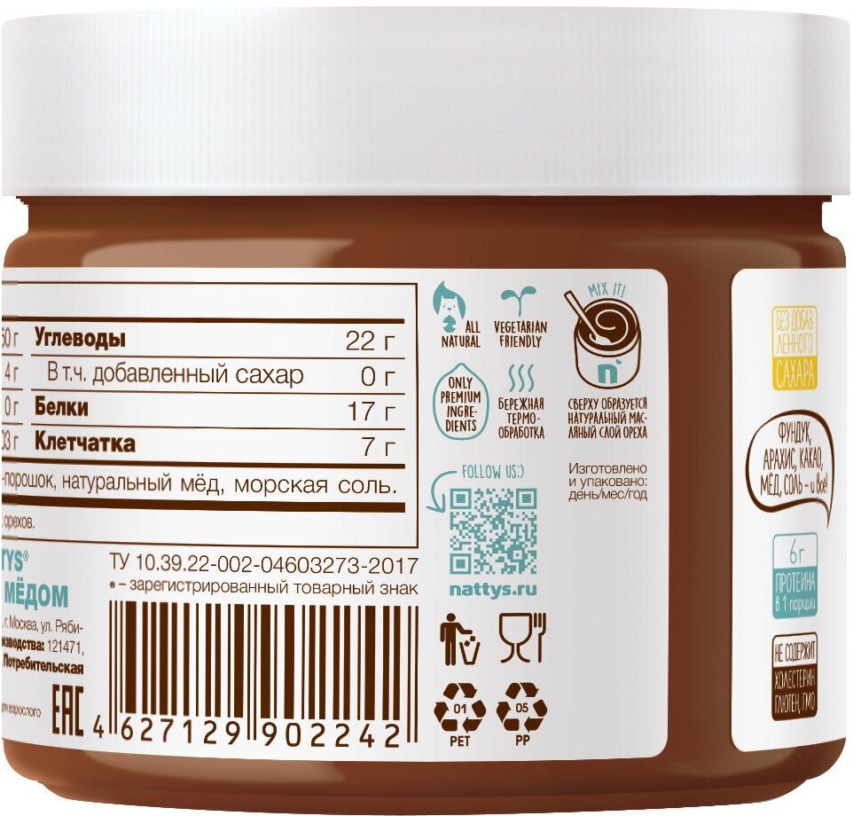 Ореховая паста Nattys Choconut с какао и мёдом, 325 гр информация: