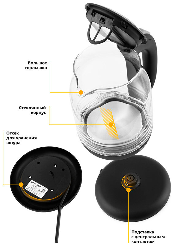 Чайник электрический KITFORT КТ-654-3 2200 Вт оранжевый чёрный 1.7 л пластик/стекло