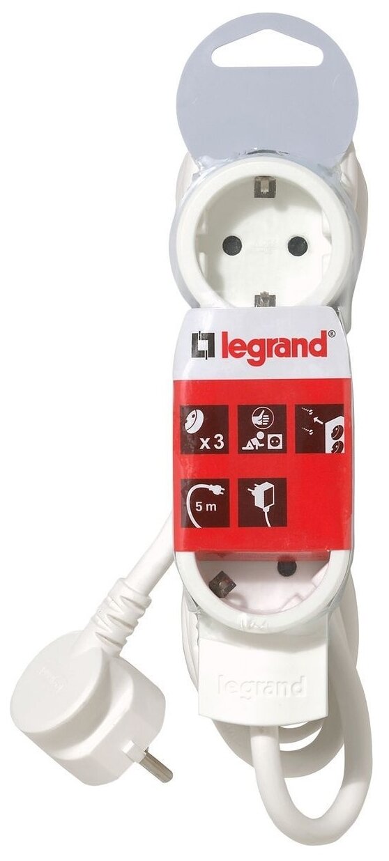 Удлинитель 3 гнезда, с заземлением, 5 м , белый Legrand 695003 информация: