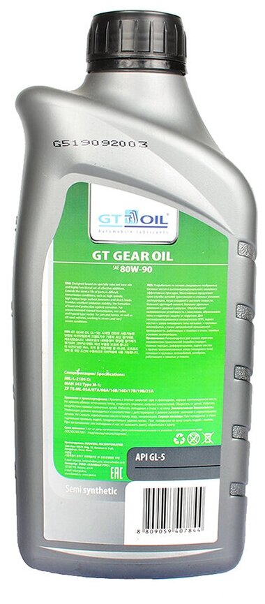 Масло трансмиссионное GT OIL Gear Oil 80W-90 GL-5 полусинтетика 1 л информация: