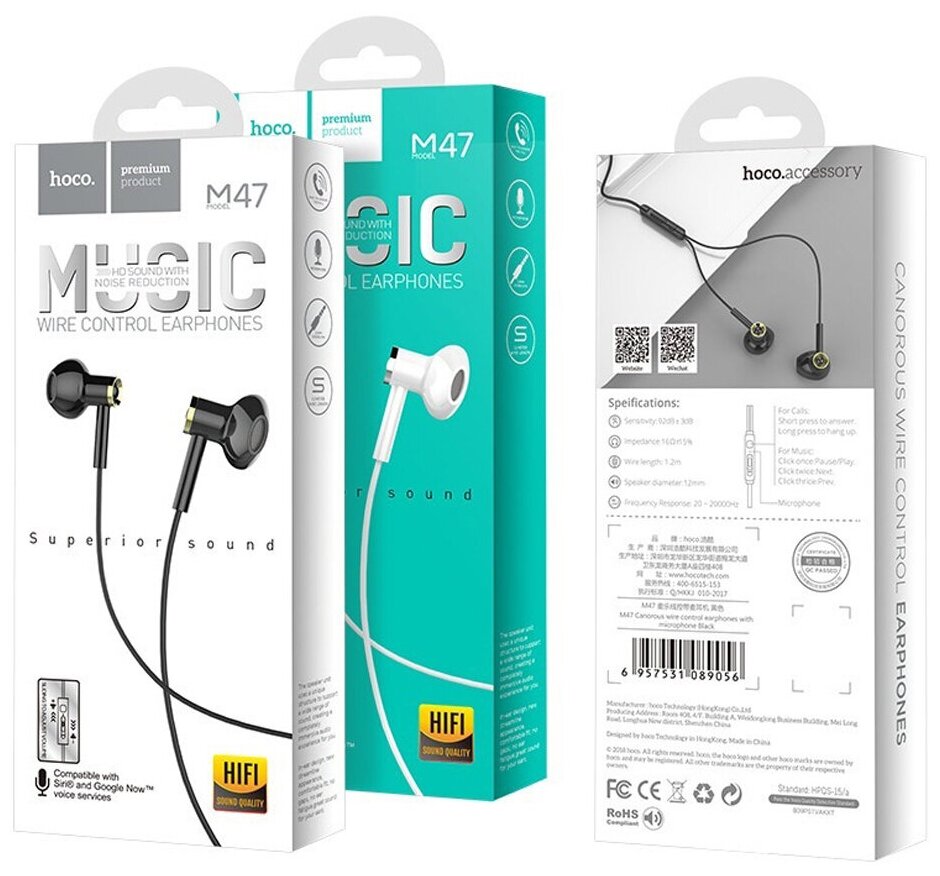 Наушники внутриканальные проводные HOCO M47 Canorous, микрофон, кабель 1.2 м, цвет чёрный