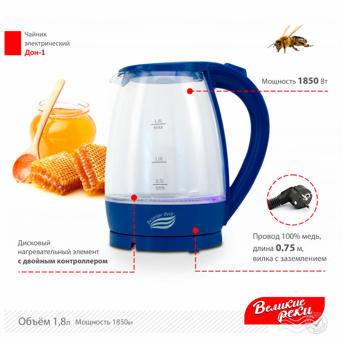 Чайник электрический Великие Реки Дон-1 синий, 1,8 л, стекло, 1850 Вт