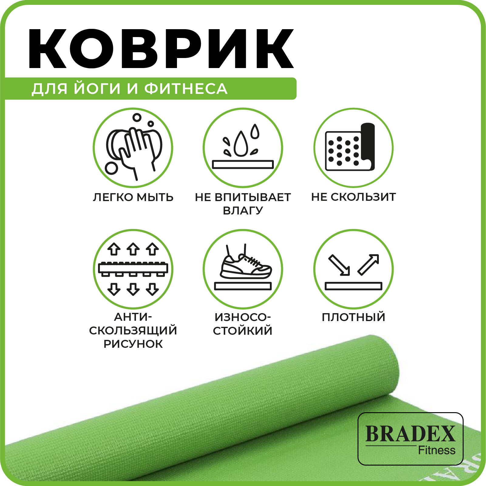 Коврик для йоги и фитнеса, Bradex (товары для спорта и отдыха, зеленый, 173 х 61 х 0,3, SF 0399) 1 380 ₽